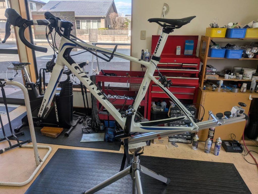 ブレーキシューを新品、ホイール振れ取り、ブレーキは前ステンレス、後ポリマー、シフトは前後ポリマータイプ、BBはSMBB92に交換。