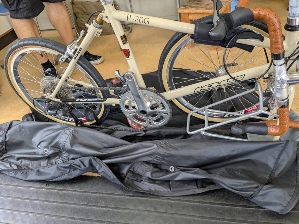 今回見せていただいたのは半分に折らない方式。専用の輪行袋も販売されており秀逸なのがこの専用輪行袋だと背負って持ち運べるようになってる!
