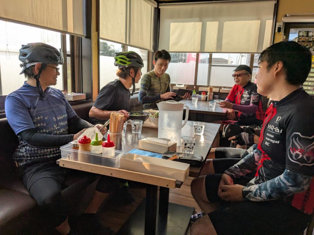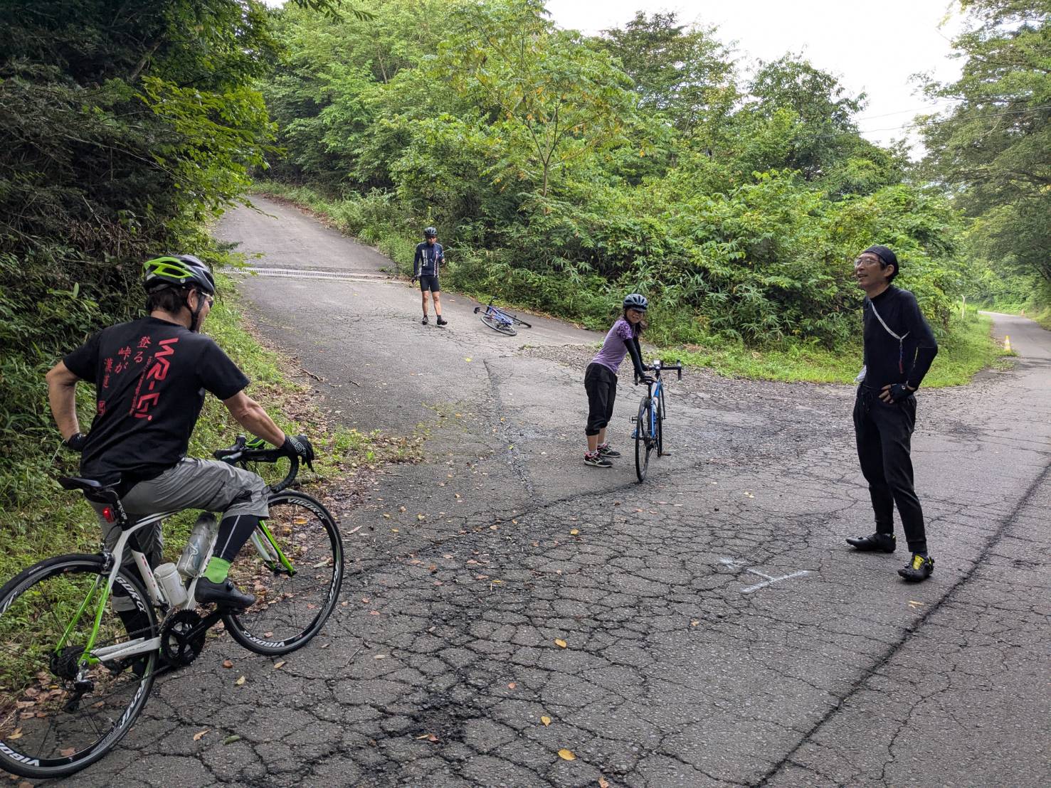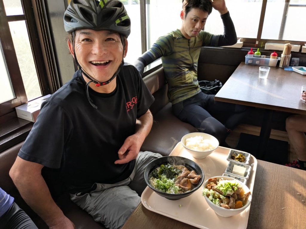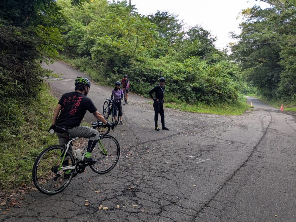 鹿狼山市場で小休憩したら、みんな大好きな鈴宇峠へ。岩崎さんと談笑しながら登り終え、オカワリで迎えに行くと、若松さん、菊池さん、亮子ちゃんの3人でデットヒート。ちょっと遅れて高橋さんの強烈な追い込みと、なんかエグイ戦いが繰り広げられてた。