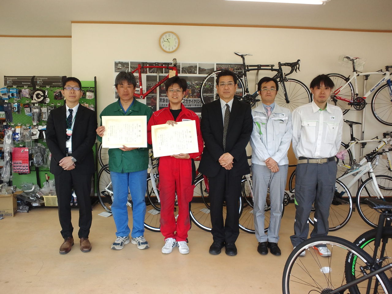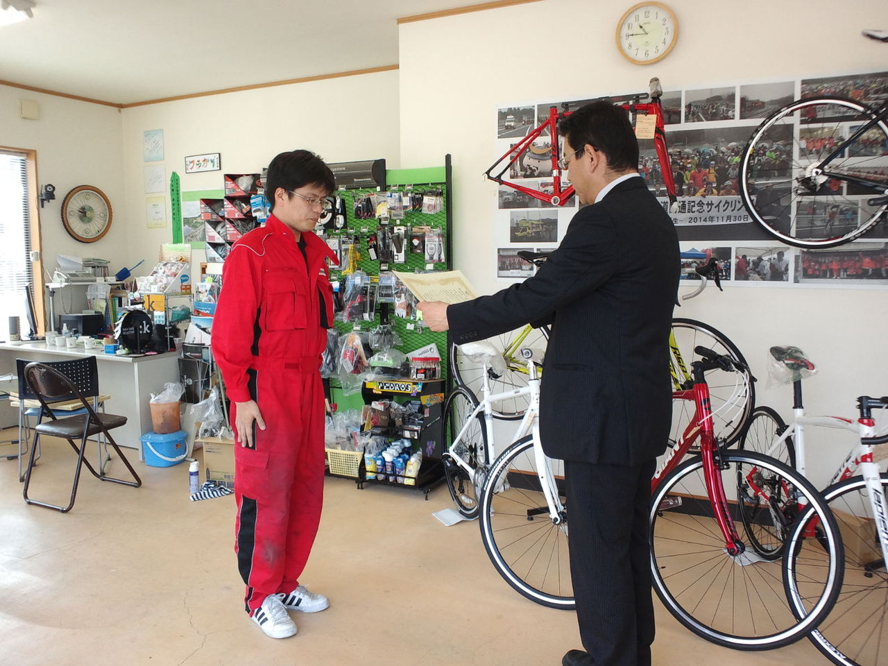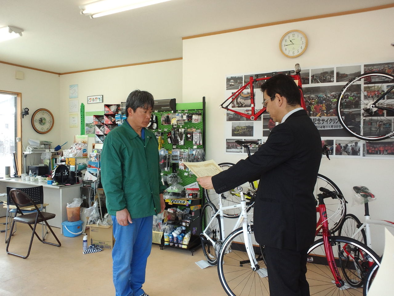 NEXCO相馬工事事務所の宮入所長様におこしいただき、相馬市サイクリング協会を代表して鈴木一弘会長が感謝状をいただきました。