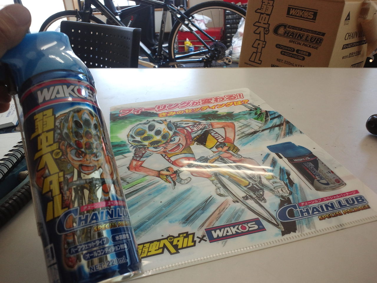 WAKO’S x 弱虫ペダル 製品情報 2015.08.07 やっと入荷しました!WAKO’Sから発売されているチェーンルブに弱虫ペダルVer 通常よりも若干おおい220ml入って 税抜 2000円 さらに、クリアファイルも1本に1枚プレゼント!! 当店では限定24本です。 残念ながら通信販売はしておりません。当店御来店の方へのみの早い者勝ちとさせていただきます。