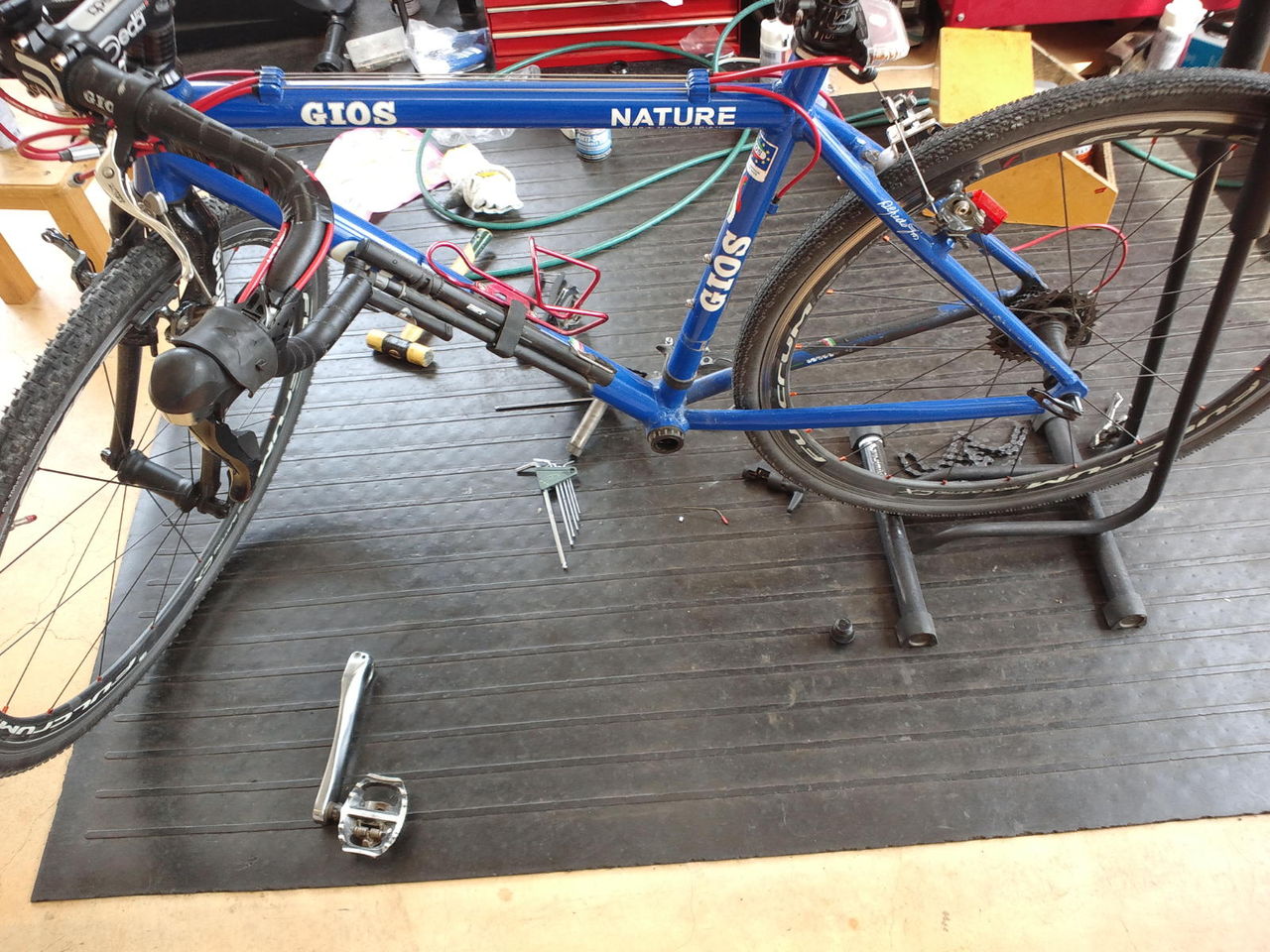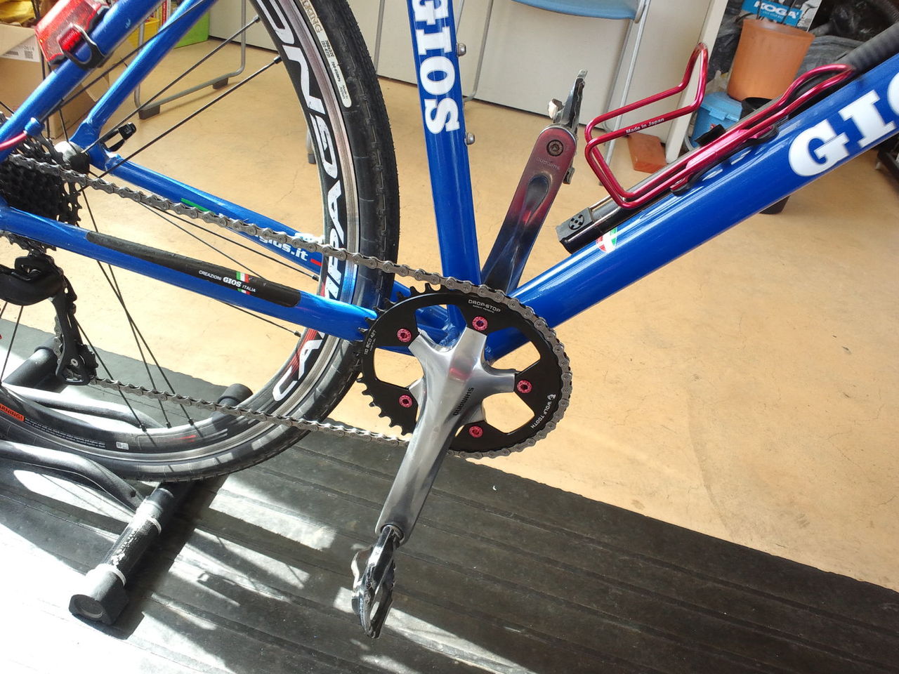 GIOSフロントシングルで楕円化 組上げ作業工程 2016.04.11 菊地さんのGIOSがさらにカスタムされました。もう残ってる部品はフレームとフォークのみ。 42Tのフロントシングル用の楕円チェーンリングにしリアを11速化。 4時あたりでは44T、11時あたりで40Tくらいの感覚で回せるはず。当店では初となる楕円リング装着者なので年間12000kmを走る菊地さんのインプレは超期待ですね!