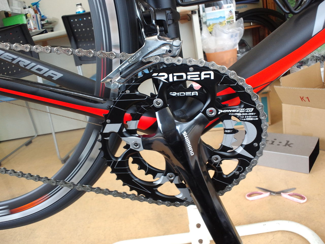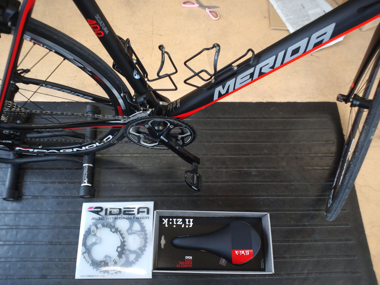 RIDEAチェーンリング 製品情報 2016.07.27 K様のMERIDAスクルトゥーラ400のカスタムを開始いたしました。 サドルをフィジークアリアンテR3へ 、チェーンリングをRIDEA50-35楕円へ変更。 フィジークはグラフィックもさることながら乗り心地も抜群。 RIDEAのギアは±2となっており、踏むべきところでは52・37と、力が必要ない部分では48・33となり巡航速度は確実にアップするという凄いやつ。 更なるスピードの世界を楽しんでください! ヒルクライムランキングへ