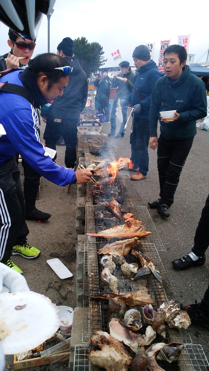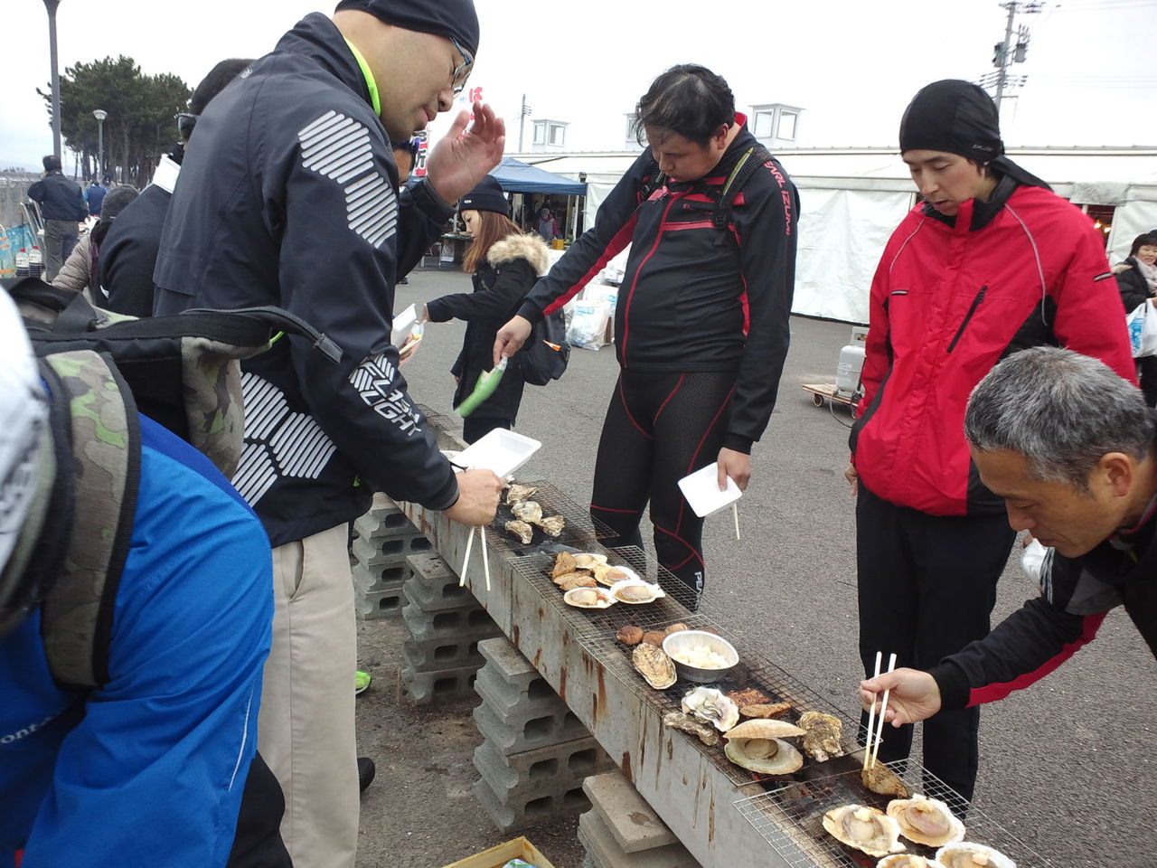 サポートカーとして同行いただいた荒武さんから荷物を受け取り炉辺焼きコーナーへ向う。