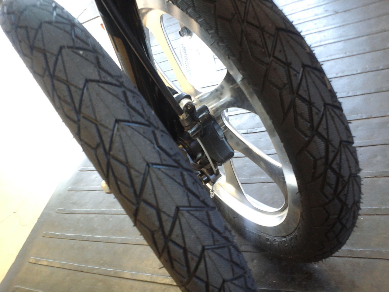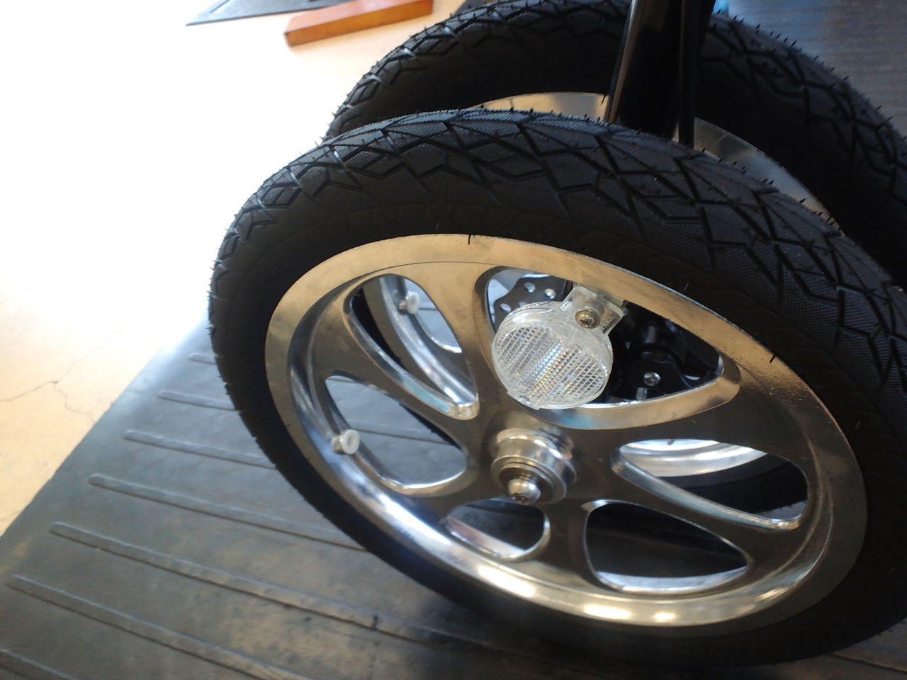 普通の車輪でのノーパンクタイヤは重くて走り辛い事や、段差の衝撃がスポークに伝わり折れやすかったり、ホイールの歪みの原因となるので扱わないようにしていたが、この形状のホイールであれば安心!さらにフロントにタイヤを二つというので負荷も分散されるので問題なし。