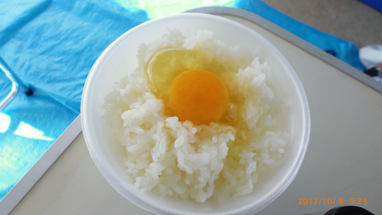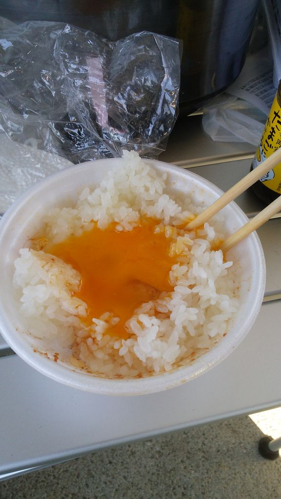 御飯も炊きあがり、ミルキーエッグを落として炊き立て御飯&生卵の究極の組み合わせで食す。