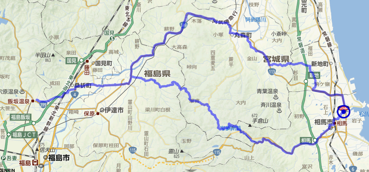 若干距離が伸びるが丸森町を経由して飯坂温泉に行くルート。