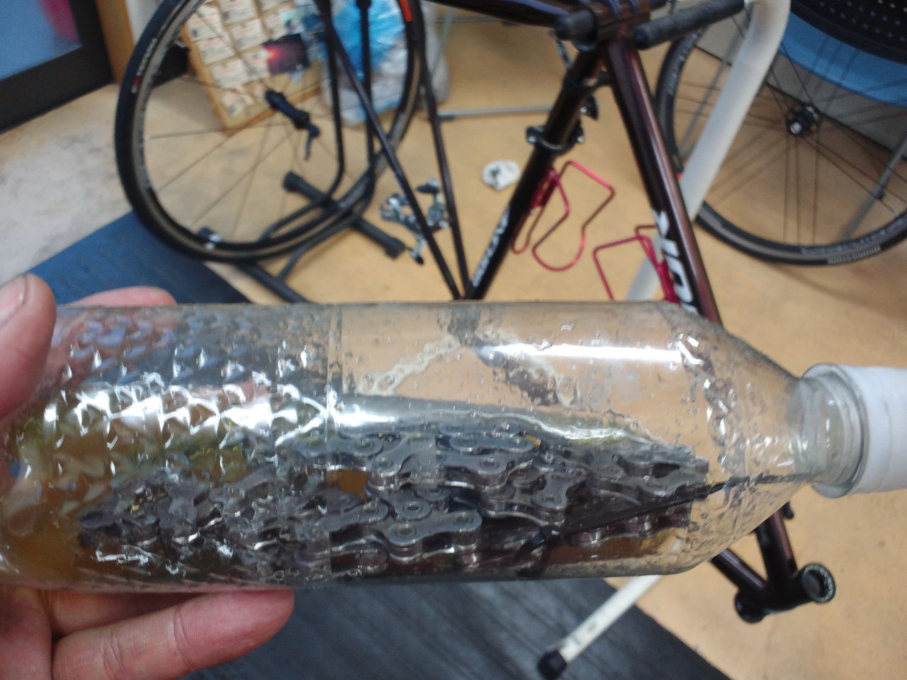 スプロケット、クランク、リアディレイラー、チェーンを洗浄してイノテック105に漬け込む。