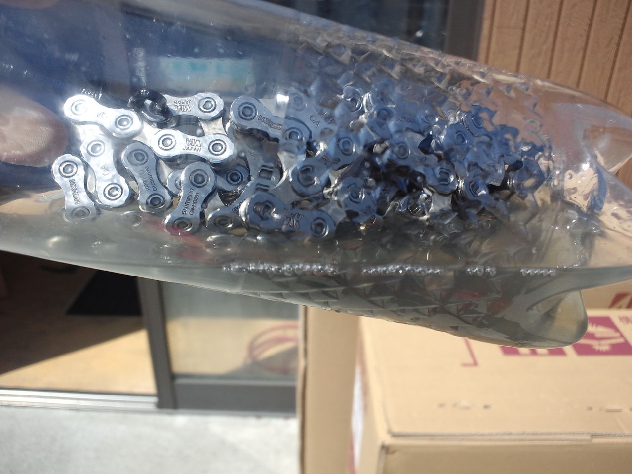 イノテック105施工する為に一度脱脂作業。最初からついてくるチェーンには粘度の高いグリスっぽいのがついており、画像のとおり汚れが強くでている。