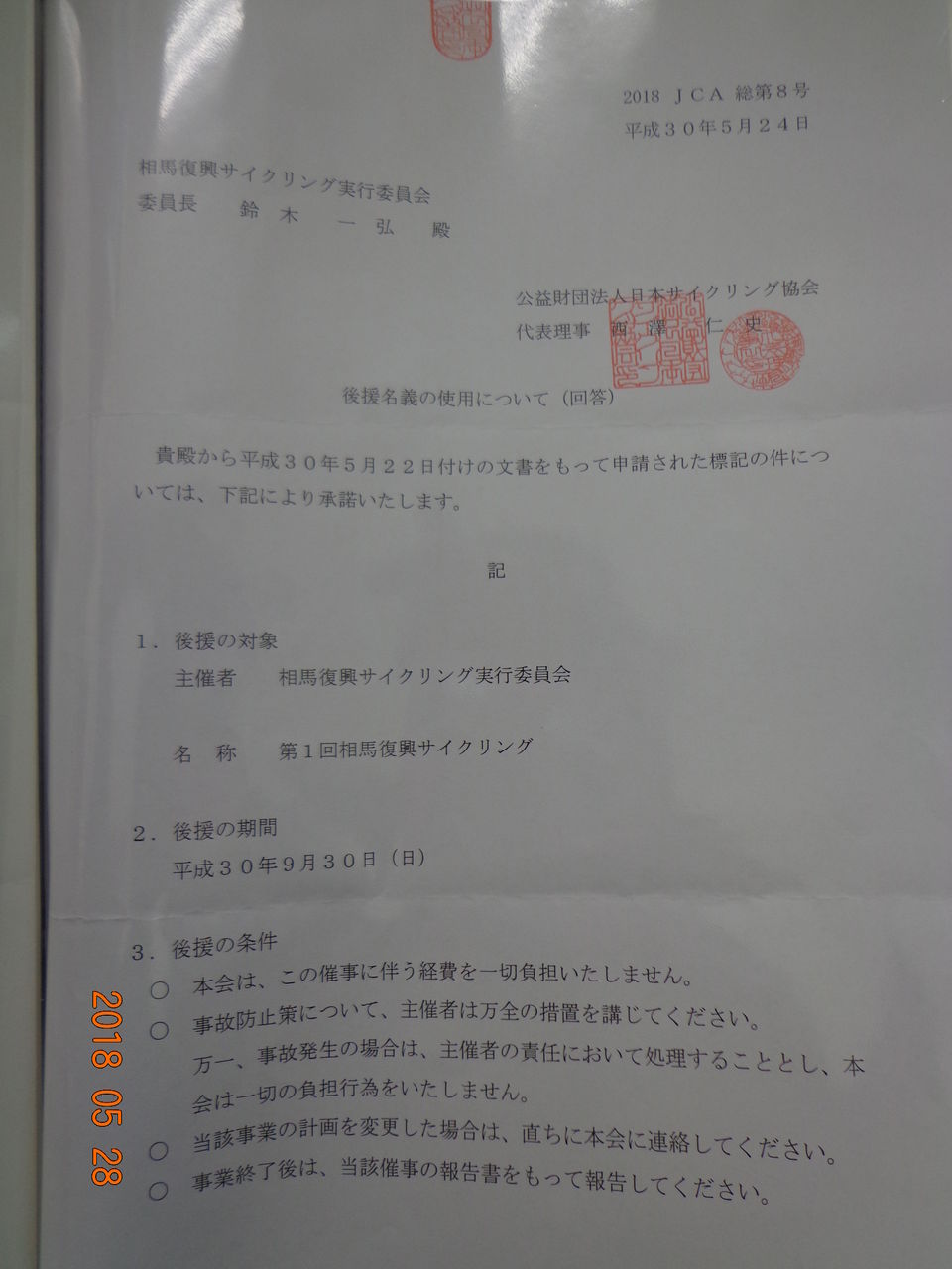 後援依頼:日本サイクリング協会 常磐自動車・相馬復興 2018.05.28 公益財団法人 日本サイクリング協会より名義後援をいただきました。 日本サイクリング協会評議員の大楽様に力添えいただきありがとうございます。運営方法・コース共に確認いただき名義後援となりましたが、実際運営する我々がしっかりと頑張らなくては!