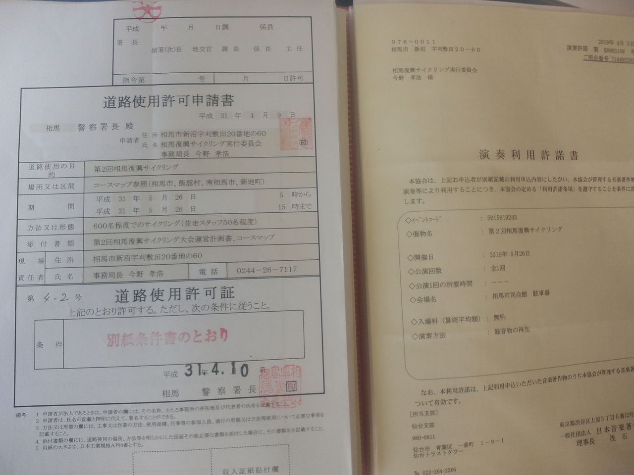 道路使用許可・音楽使用許可:第2回相馬復興サイクリング 常磐自動車・相馬復興 2019.04.13 第2回相馬復興サイクリングもいよいよ1ヶ月とちょっととなりました。ドローン班長の飯土井氏によると長期予報で5月26日は晴れになってるよ。この予報は結構当たってるよ。とのこと。こりゃ~晴れ男・晴れ女の皆さんの効果があらわれてきてるんじゃないの!! 通学自転車シーズンも一段落したので、イベントに向けた準備も加速しはじめます。まずは相馬警察署で道路使用許可、JASRACで楽曲使用許可をとりました。 エントリー頂いた皆様、着実に進めていきますので安心してくださいね!