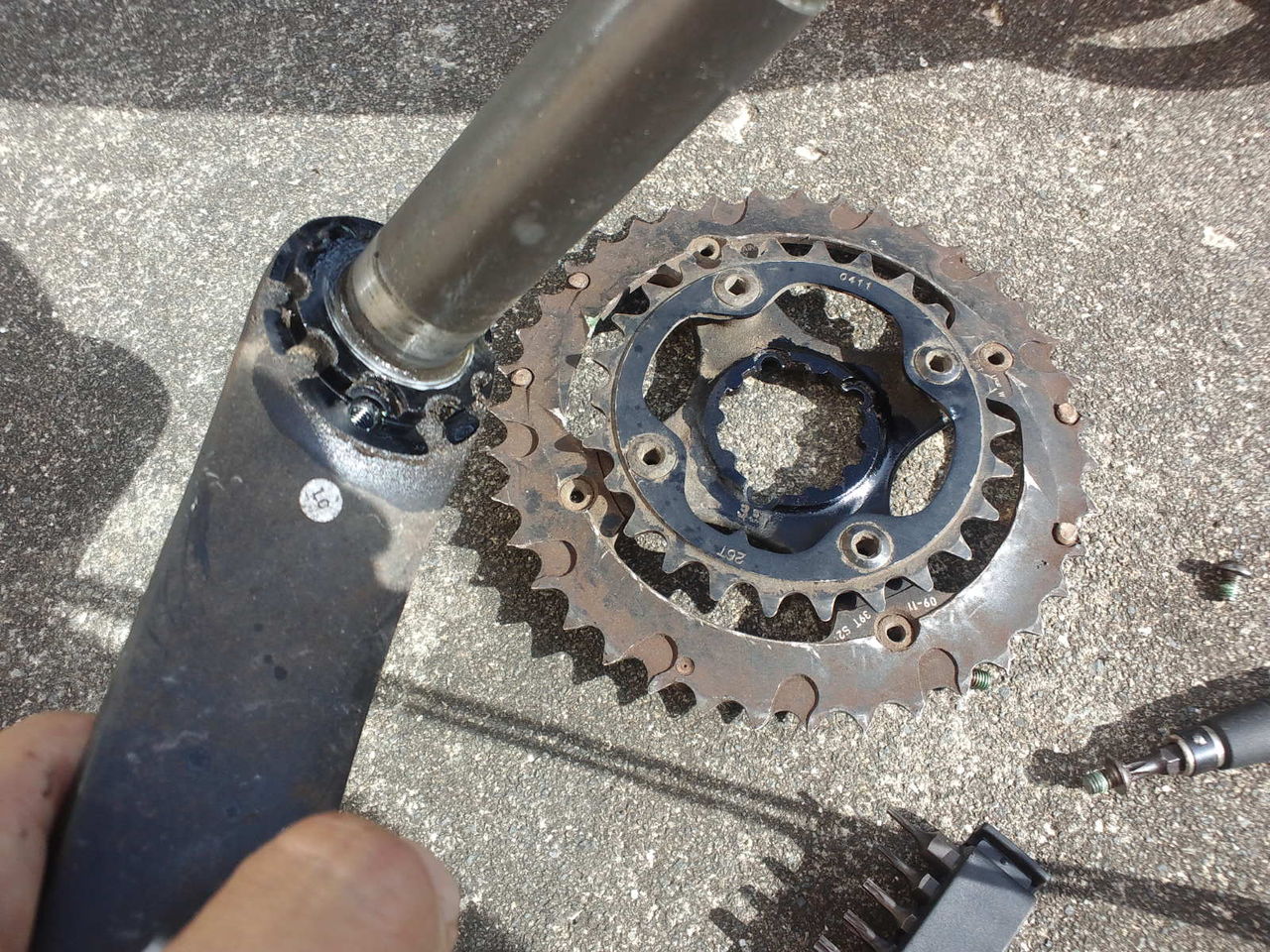 約10年の月日で、チェーンリングもスプロケットもチェーンもプーリーも完全に摩耗状態。