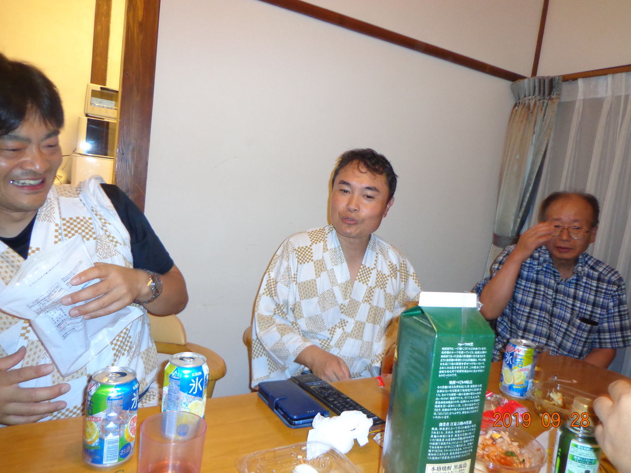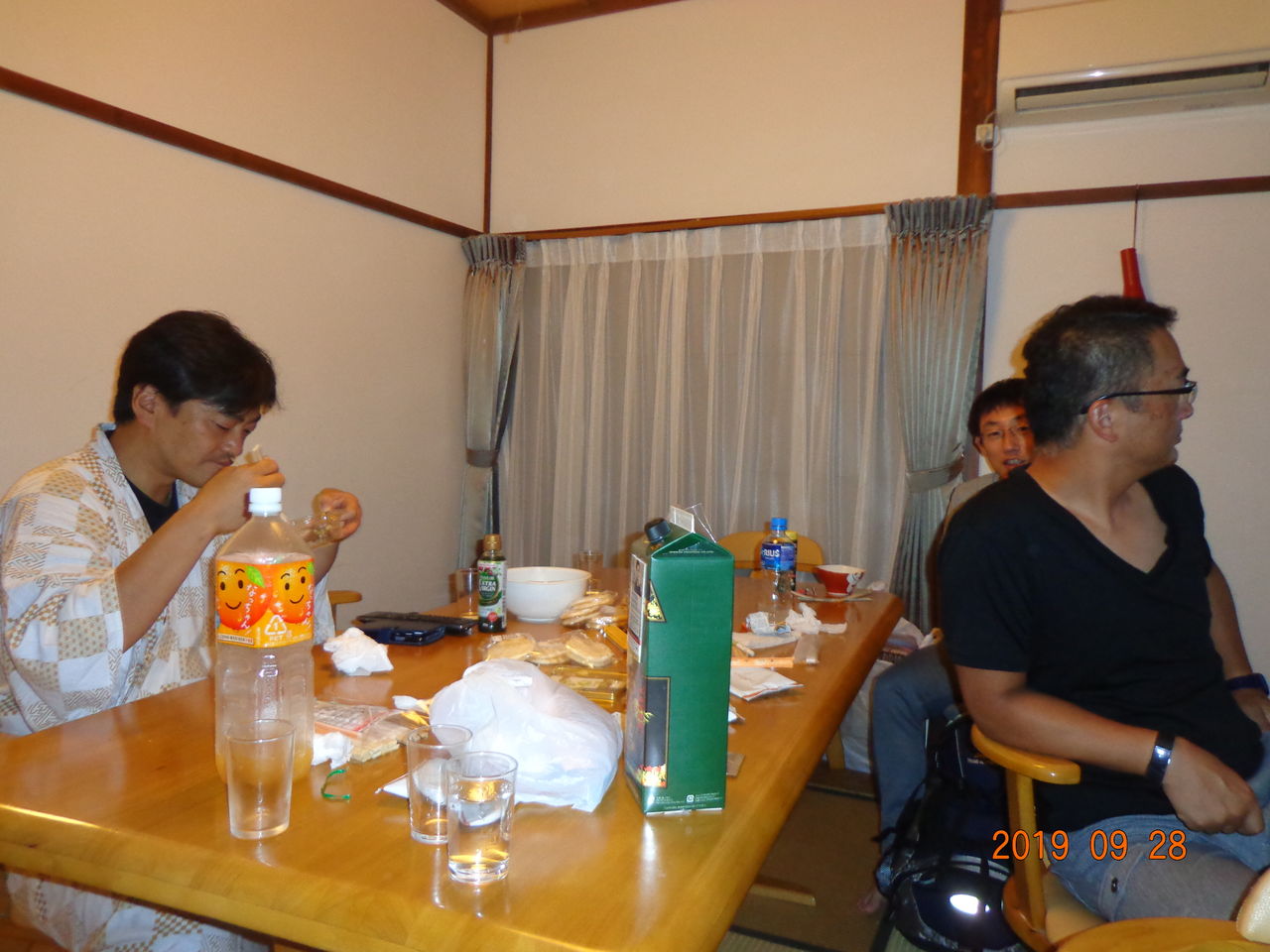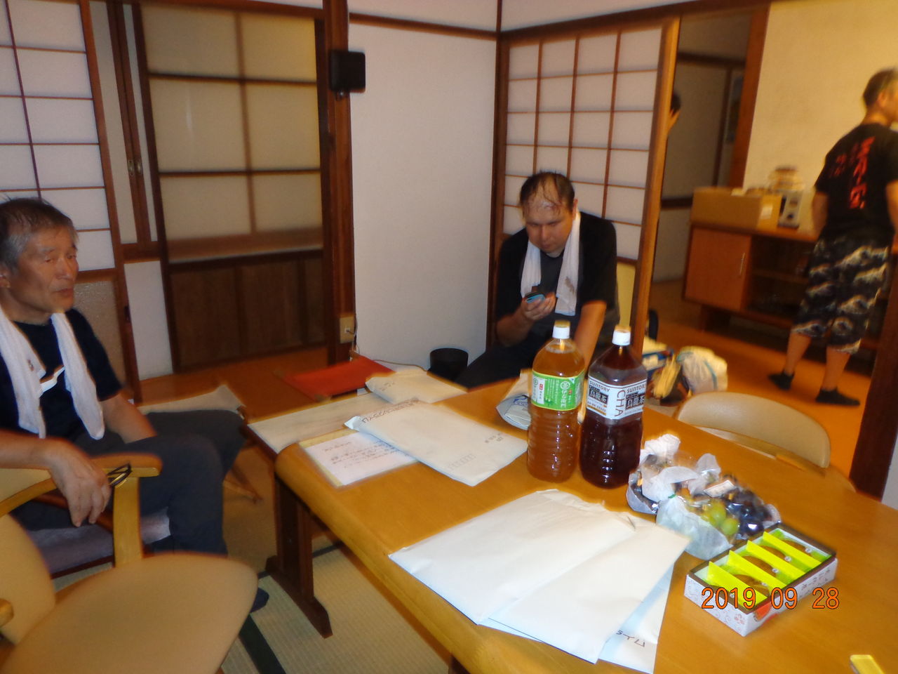 買い出しから戻ってきて、数名は風呂から上がってまったりしている。どんどん入らないと風呂がつまってしまうので数名と一緒に本館の露天風呂でまったり。