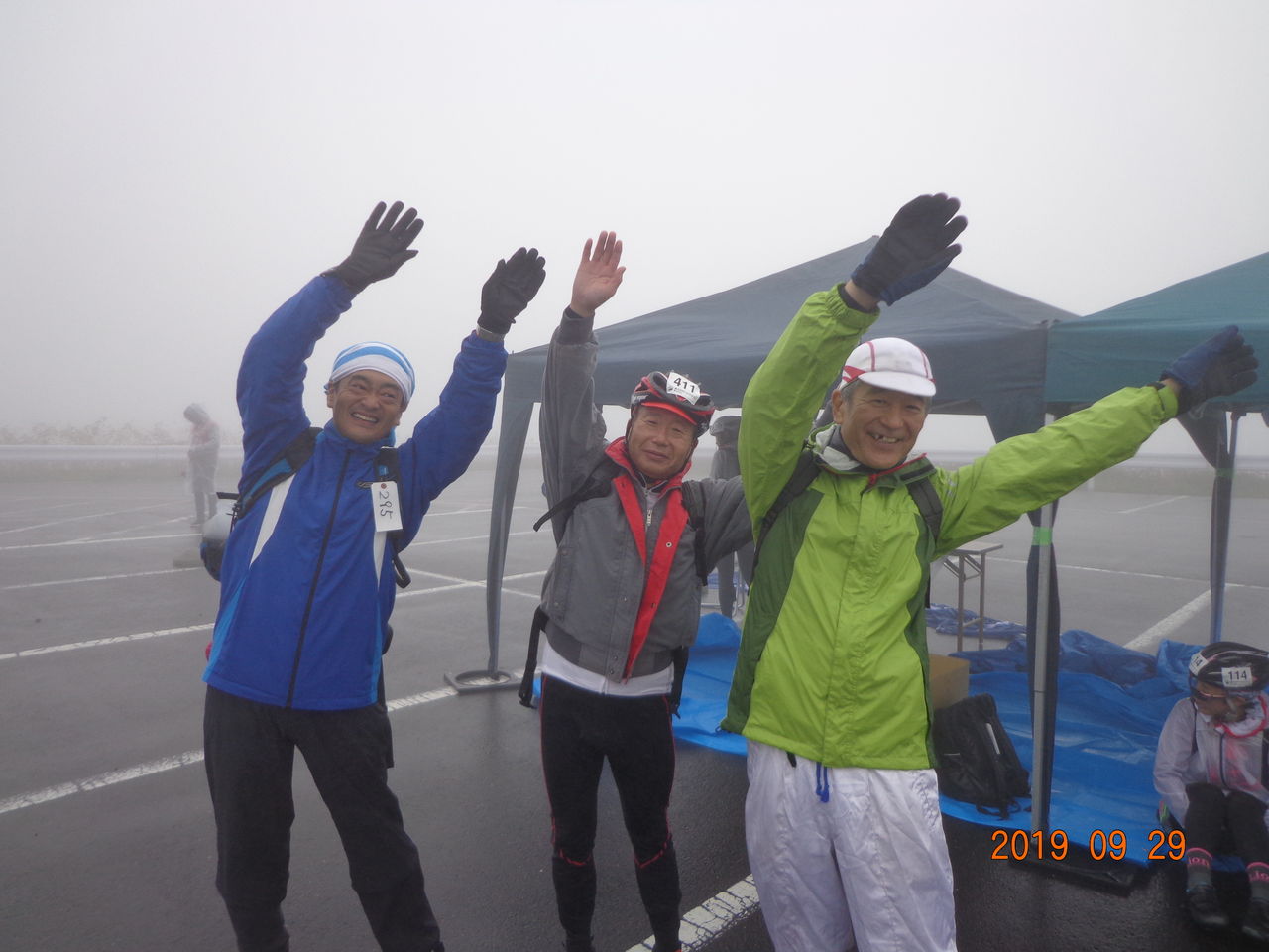 後ろを振り向くも濃い霧で見えないが、大会本部の車らしきのとI氏が会話してるっぽい。
