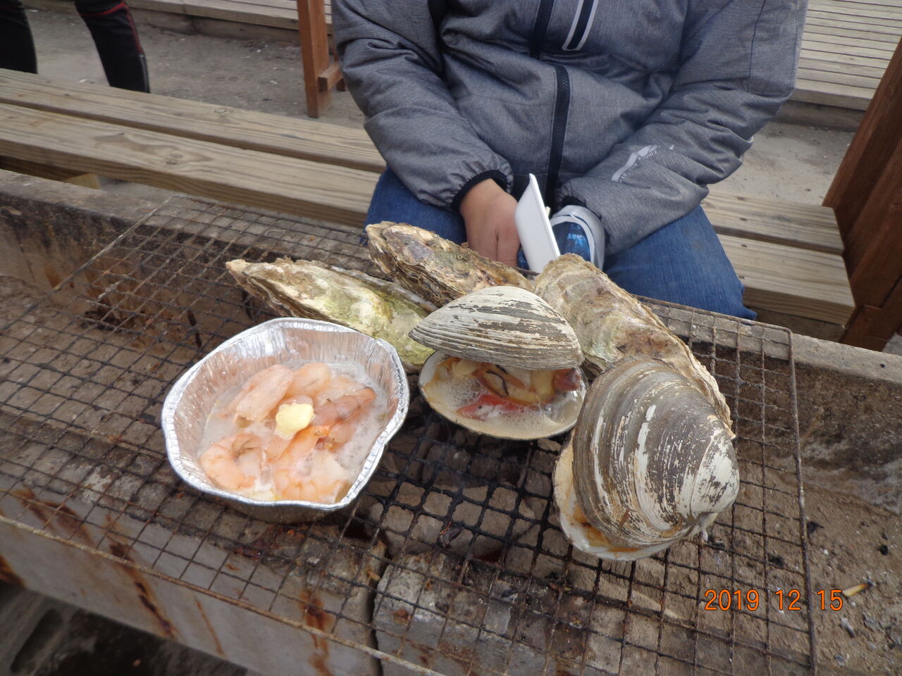伊藤さん、荒武さん、若松さん、私の4名でホタテ貝、牡蠣やホンビノス貝、ホッキ貝、エビバターなどを焼いてると、メンバー達が海産物では無く、水餃子やらセリ鍋などを片手に帰ってくる。