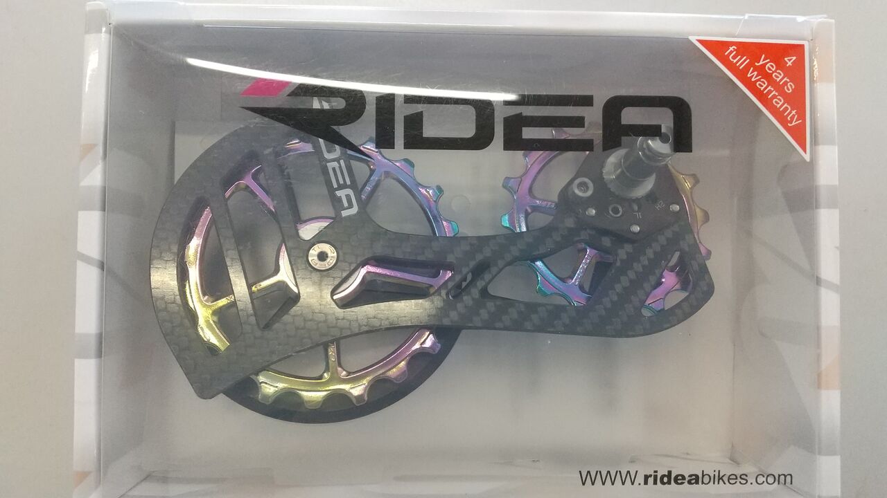RIDEA ビッグプーリーC60 オイルスリックカラー 製品情報 2020.01.20 飯土井様に注文いただいたRIDEAのビッグプーリーが届きました。 リンエイ様で限定カラーとなるオイルスリックカラー。BERNERのビッグプーリーを使っていますが、このビッグプーリーはデカい!!! ガイドプーリーが16T、テンションプーリーが20Tセラミックプーリーなものだから箱に入ってる状態を傾けただけで回り始める凄さ。 手のひら位の大きさのプーリーゲージでインパクトは物凄いものとなります。コルナゴC64との組み合わせるのが待ち遠しいです