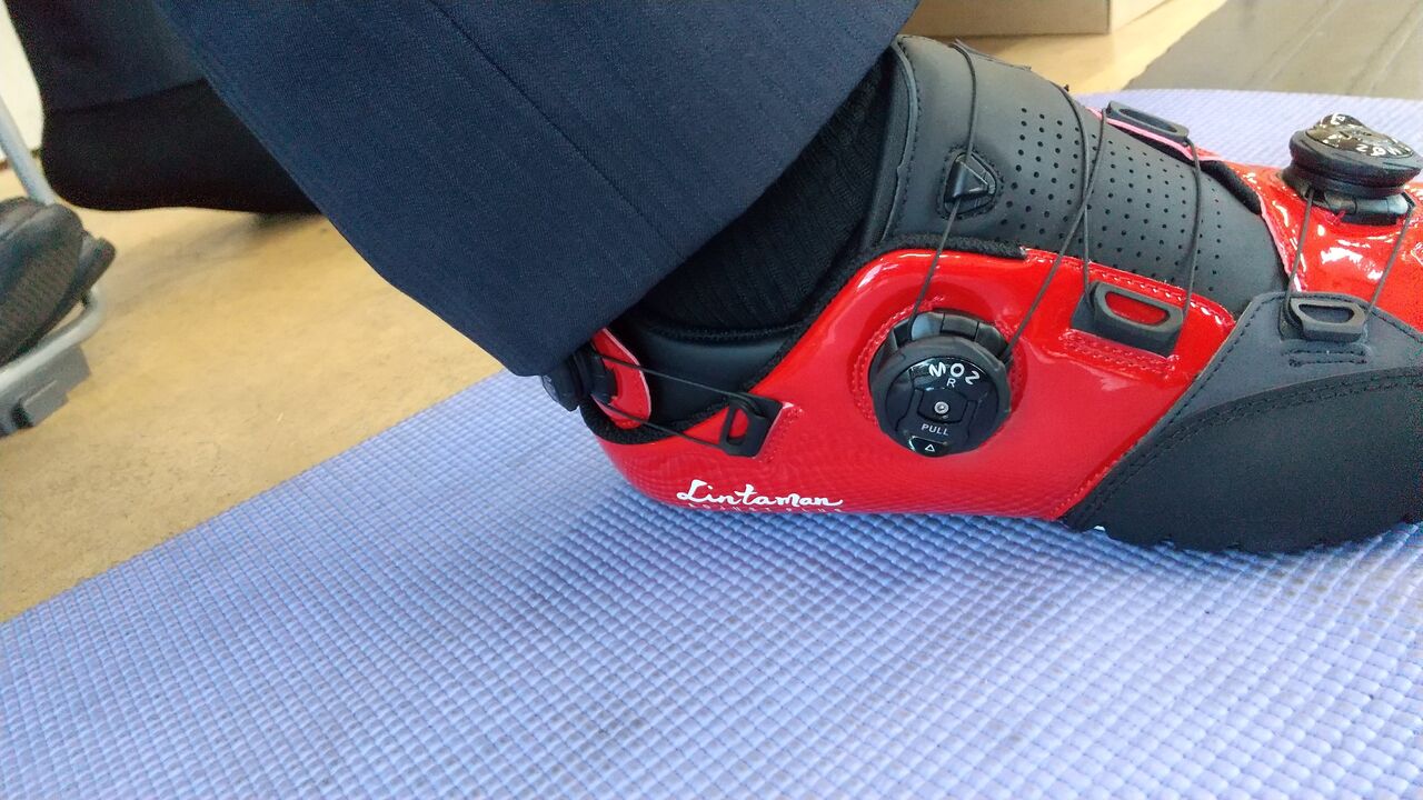 絶唱!! リンタマン アジャストプロプラス レッド 製品情報 2020.07.02 6月最終日。H様に約10カ月前に注文いただいてたシューズが到着。 10ヶ月という月日は、足のサイズを変えてしまうことはないのかとヒヤヒヤしてたりもしましたが、そこは爪先、甲、踵と3か所稼働するアジャストプロプラス。 履いた瞬間のH様の恍惚として目を閉じる瞬間に立ち会えたことは、シンデレラにガラスの靴を履かせた従士の気分。12時の鐘が鳴ってもその魔法はとけませんね! まだ到着待ちが2名おりますので全て揃ったら10ヶ月遅延に対して、土下寝による謝罪会見しますので少々お待ちください。