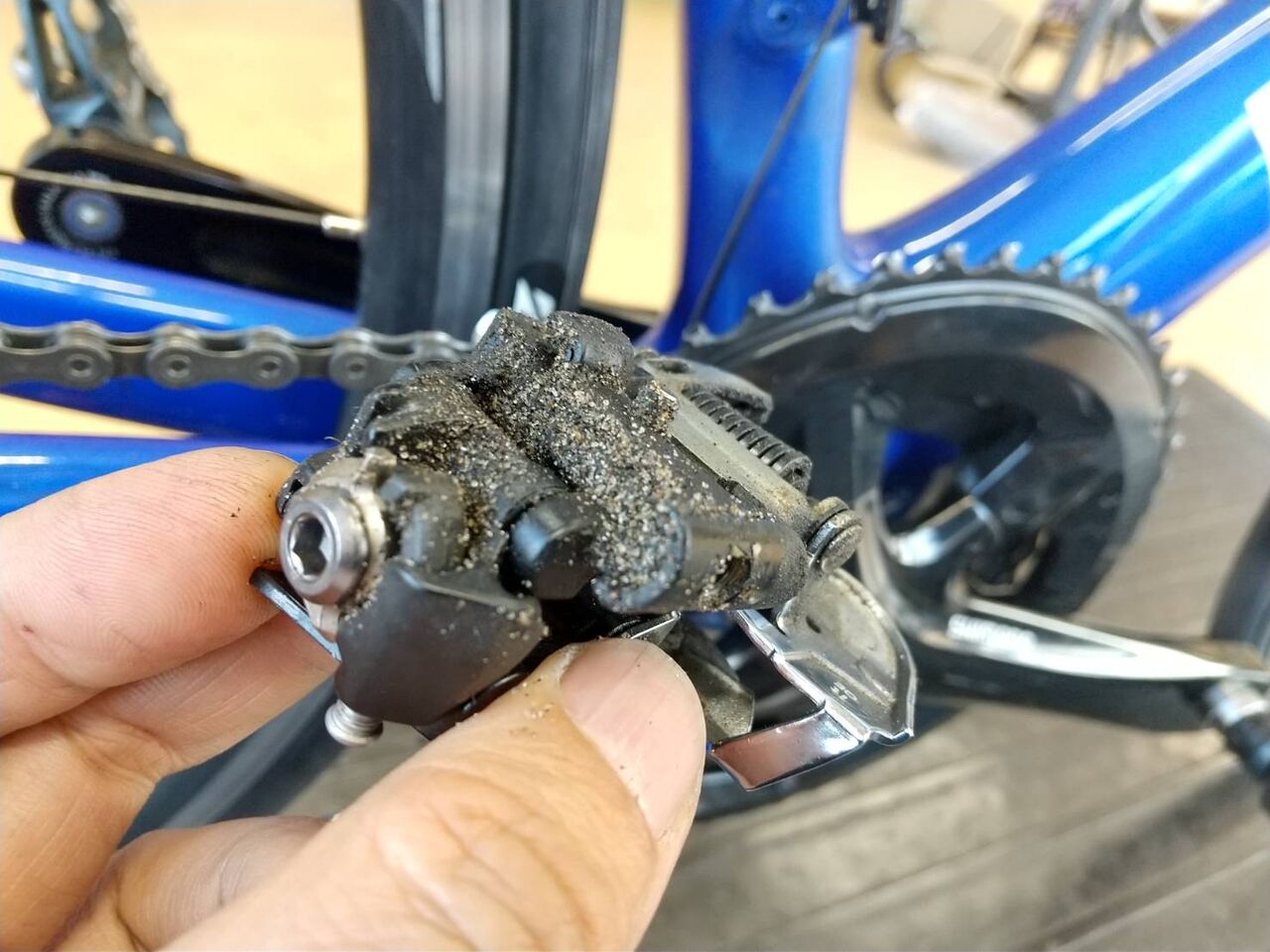 フロントディレイラーや、リアディレイラーに砂埃がかなり溜まってたので、掃除して完了。