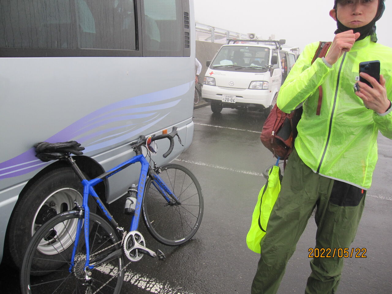 すでに到着してる他の選手達はハッチバッグを開けて、その下でローラー台でウォームアップしていたが、余りの雨の強さに片付けして車に避難しはじめている始末。