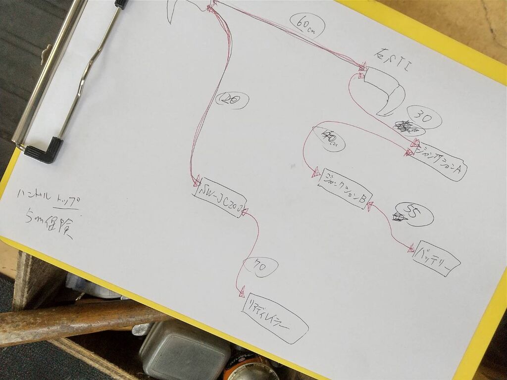 実際に接続していくとリアサスの可動部がどうしてもJC200と干渉しそう。当初はハンドル周りはすっきりさせたくて考えていたが、新しい接続図を書き直して(ヘッドチューブ付近でワイヤレスユニットで繋ぎなおし)クリア!