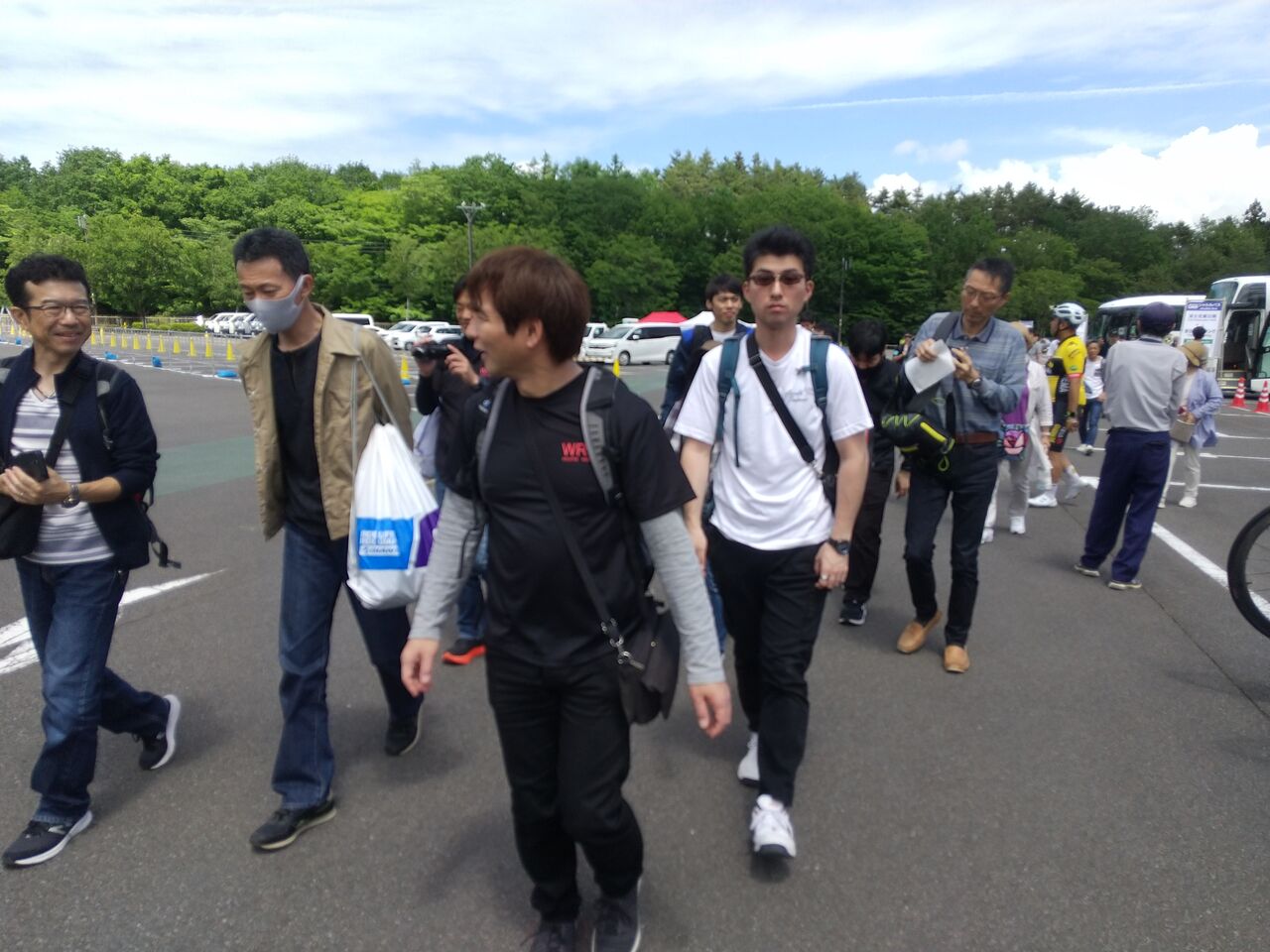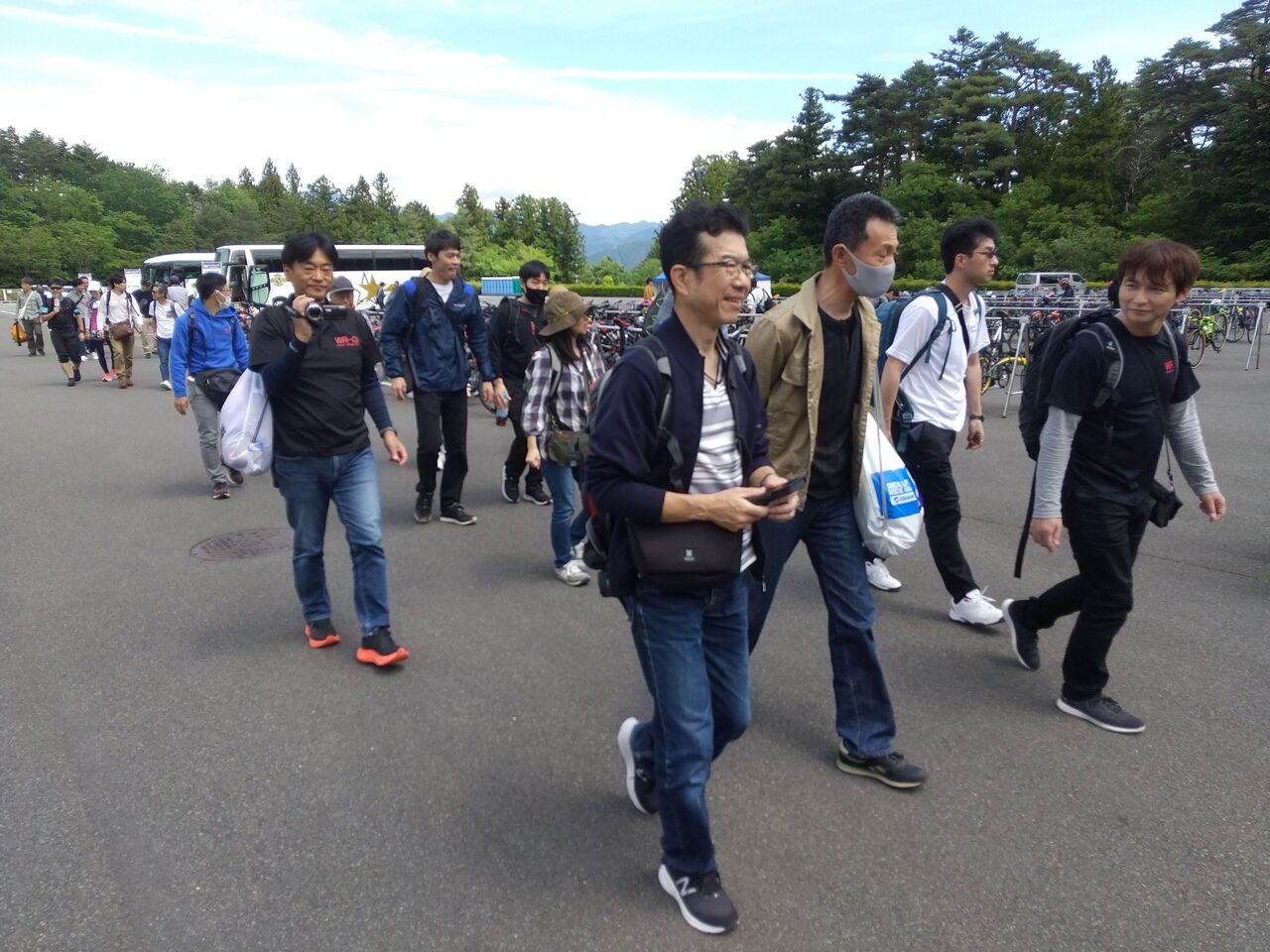 すでに駐車場は混雑しており試走も兼ねるのかレース前の準備のように忙しなく自転車を組み立ててたりウェアに着替えたりしてる人が多い。