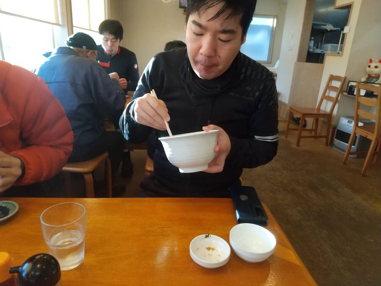 ラーメンが来る前にTKG準備。ラーメン到着前に食べ始める熊川さん。