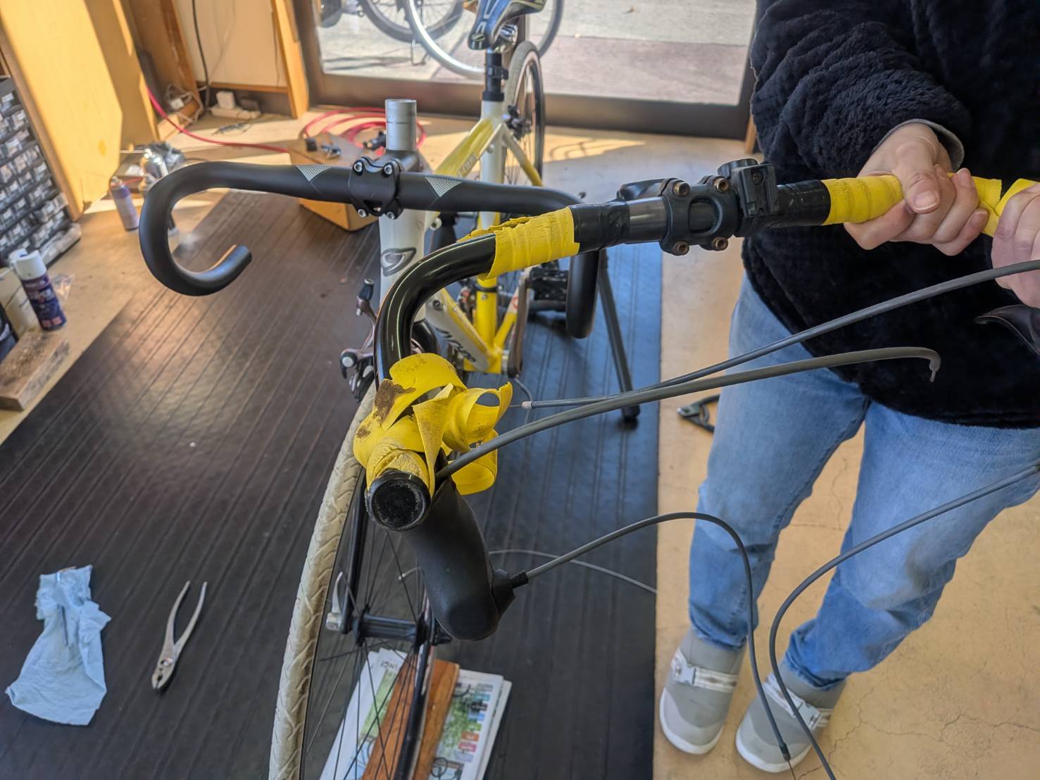 さて、前オーナーはロードバイクをブルホーン化していたのを譲り受けたとのことで、ドロップハンドルに戻して、ワイヤー類は全てポリマーへ。ブレーキシュー、タイヤも新品に交換。